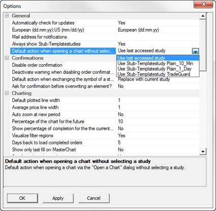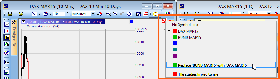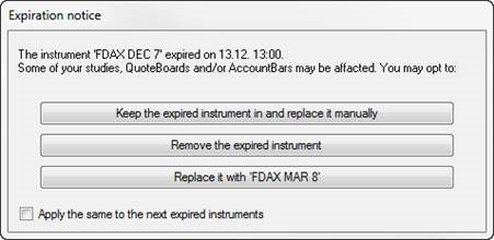 • NanoTrader zeigt Studien jetzt auch dann an, wenn der zugrundeliegende Kontrakt abgelaufen ist. Das "Öffnen"-Icon des Chart-Fensters hat einen neuen Eintrag "Diese Studie auf den aktuellen Kontrakt anwenden", so dass leicht auf den aktuellen Kontrakt umgestellt werden kann.