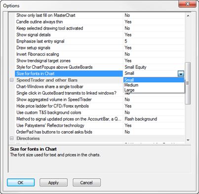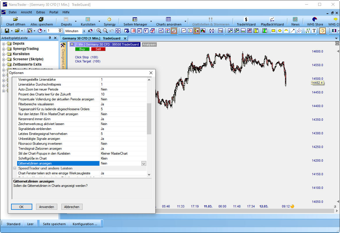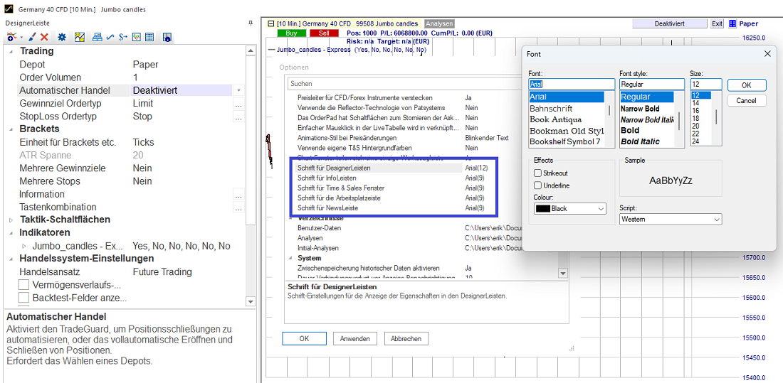 • NanoTrader erlaubt die Konfiguration der Schrifteinstellungen für DesignerLeiste, InfoLeiste, NewsLeiste, Time & Sales Leiste and Arbeitsplatzleiste.