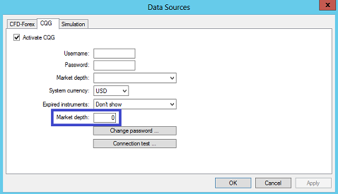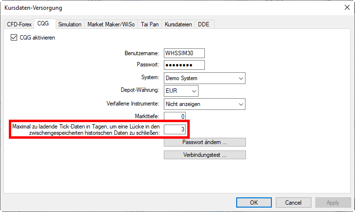 • CQG: Die Anzahl der fehlenden Tage mit Tick-Daten, die vom Server nachgeladen werden sollen, kann über "Extras | Kursdatenversorgung | CQG" eingestellt werden: