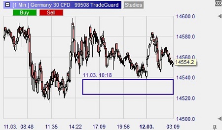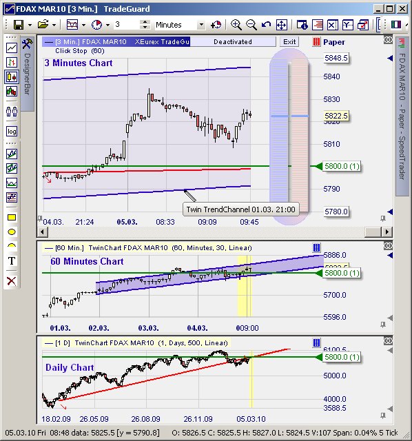 • Zwillings-Charts erlauben die Darstellung der Preisdaten in einer vom MasterChart unabhängigen Aggregation. Beispielsweise kann der MasterChart 3-Minuten-Kerzen anzeigen, ein Zwillings-Chart 60-Minuten-Kerzen und ein weiterer Zwillings-Chart Tagesdaten. Auf diese Weise können kurzfristige Preisbewegungen sehr einfach in Relation zu längerfristigen Bewegungen eingeschätzt werden. Außerdem sind Zwillings-Charts sehr hilfreich beim Bestimmen langfristiger Trends sowie von Widerstand/Unterstützungslinien, die auch beim kurzfristigen Handel berücksichtigt werden sollen.