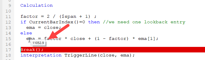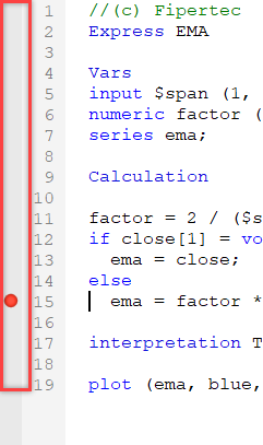 Um den Express-Code zu anzusehen oder zu ändern, doppelklicken Sie auf den BETrailStop-Eintrag in der DesignerLeiste, nachdem der Stop übder den "Indikator hinzufügen"-Dialog eingefügt wurde.