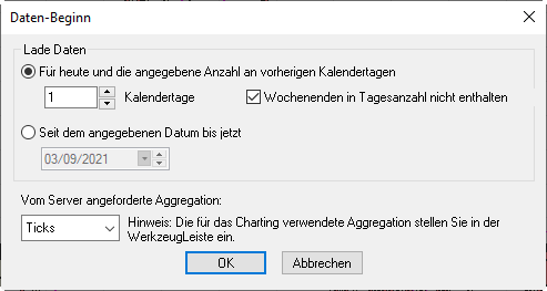 • Der Dialog für das Laden historischer Daten ermöglicht die Einstellung, dass Wochenenden nicht in der der konfigurierten Tagesanzahl enthalten sind.
