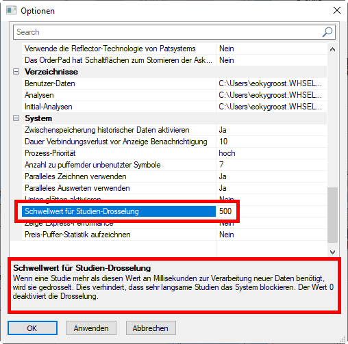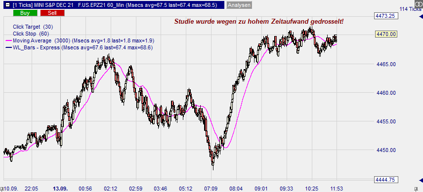 • Studien, deren Berechnung zu viel Prozessorleistung erfordert, können gedrosselt werden. Dies kann zum Beispiel durch ein schlecht programmiertes Express-Skript oder zu viele geladene historische Daten verursacht werden. Wenn die durchschnittliche Rechenzeit für eine Studie den konfigurierten Schwellwert überschreitet, wird die Studie gedrosselt. Gedrosselt bedeutet, dass die Studie nur noch einmal alle fünf Sekunden aktualisiert wird. Eine gedrosselte Studie ist an der entsprechenden Einblendung im MasterChart zu erkennen:
